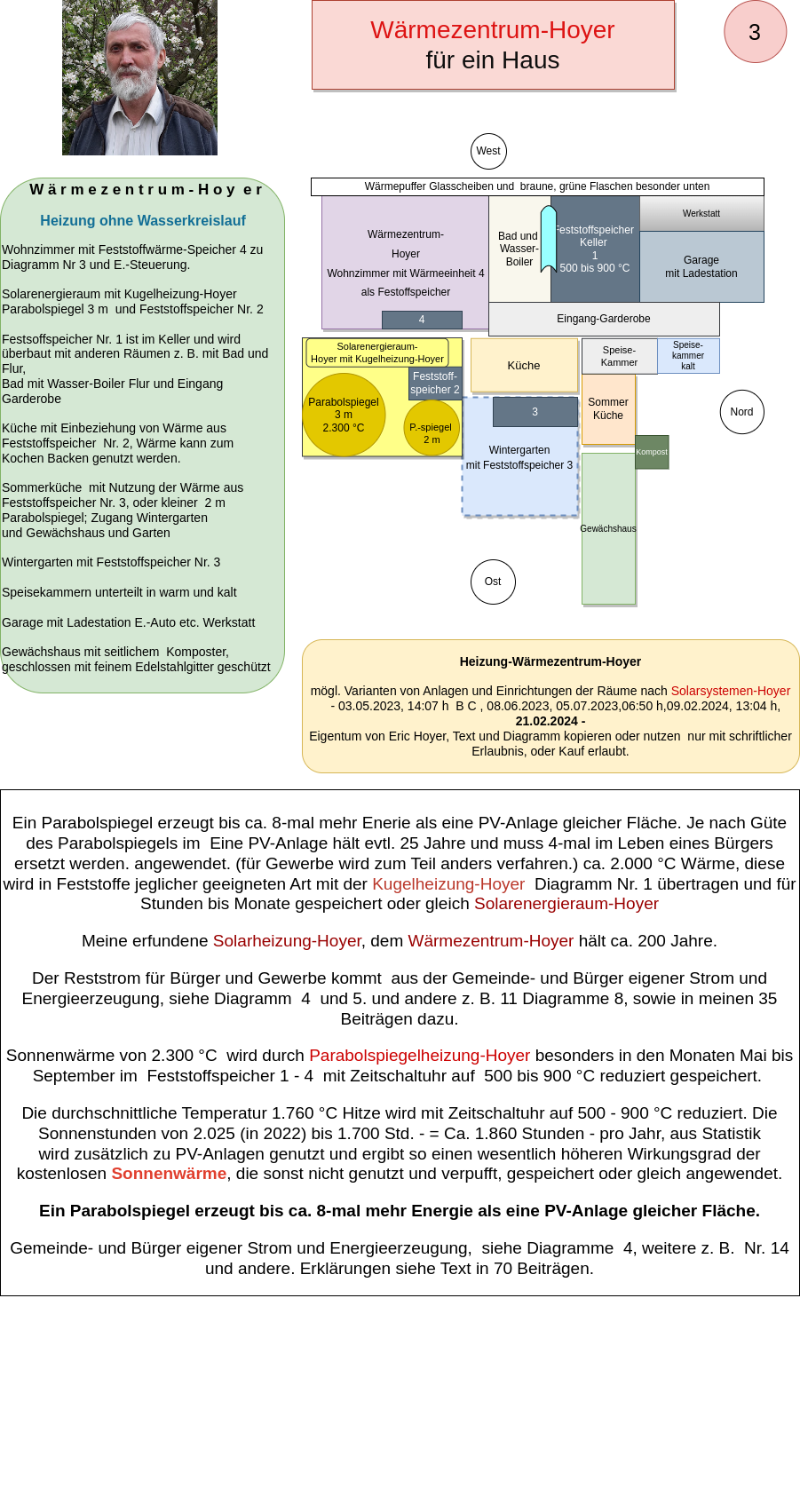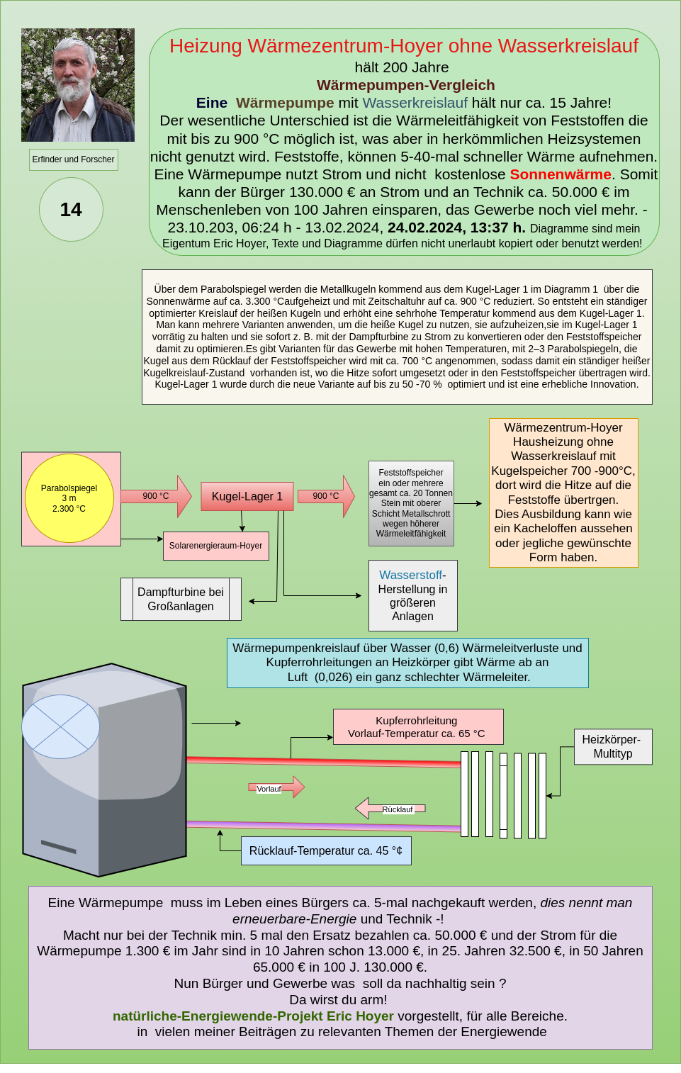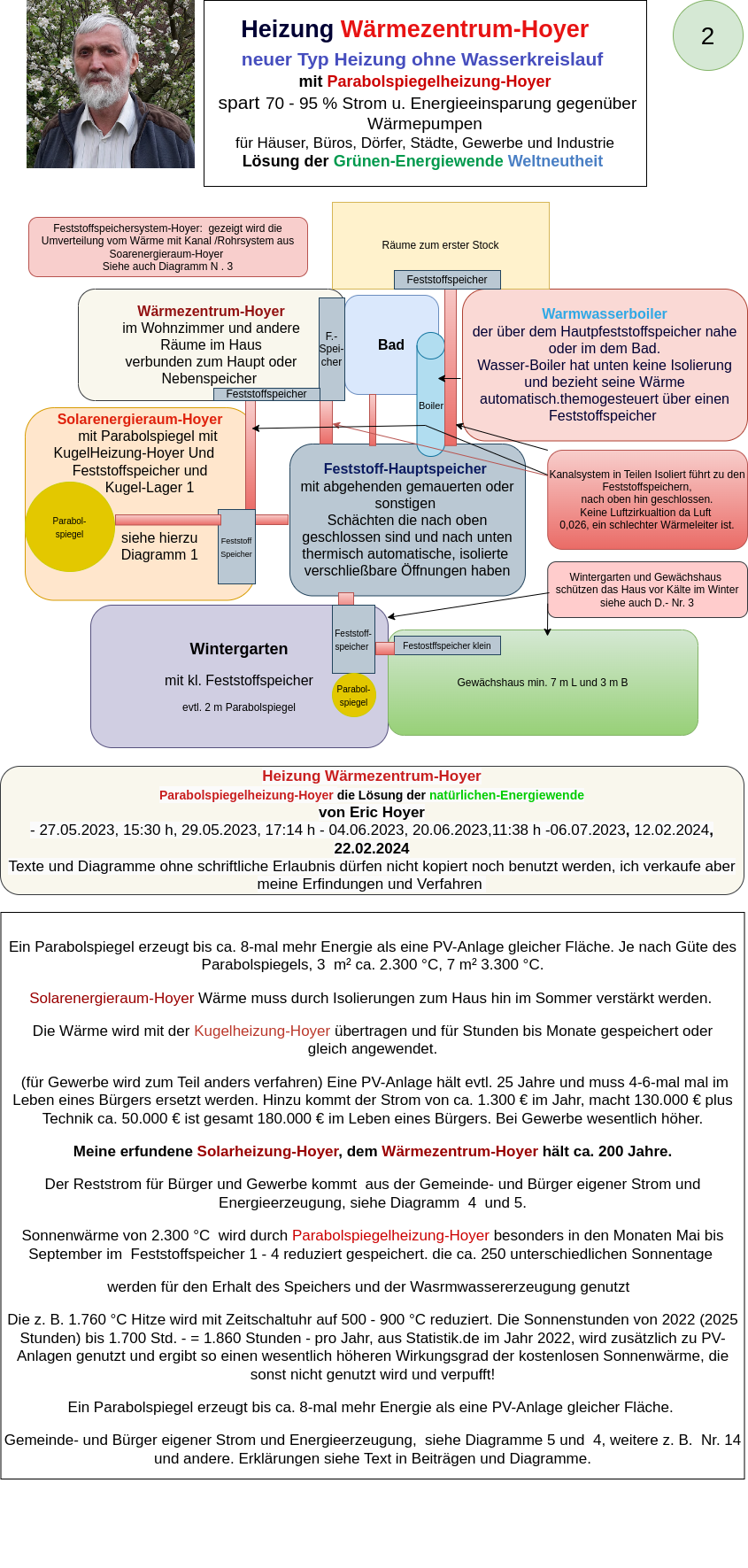 Lösungen mit dem Wärmezentrum-Hoyer als neuer Typ Heizung ohne Wasserkreislauf, optimiert über dezentrale Natürliche-Energiezentren-Hoyer und Grundlastsicherheit bis zum Umbau von Atomkraftwerken mit überwiegender grünen Wasserstofferzeugung, mit Einsparungen von 100 bis 300 Milliarden für Staat und Bürger und Gewerbe in 10 Jahren. Es gibt zurzeit keine effektiveren Lösungen der Energiewende und besonders keine für eine tatsächlich grüne Wasserstoffherstellung ohne Ende als meine von Eric Hoyer.